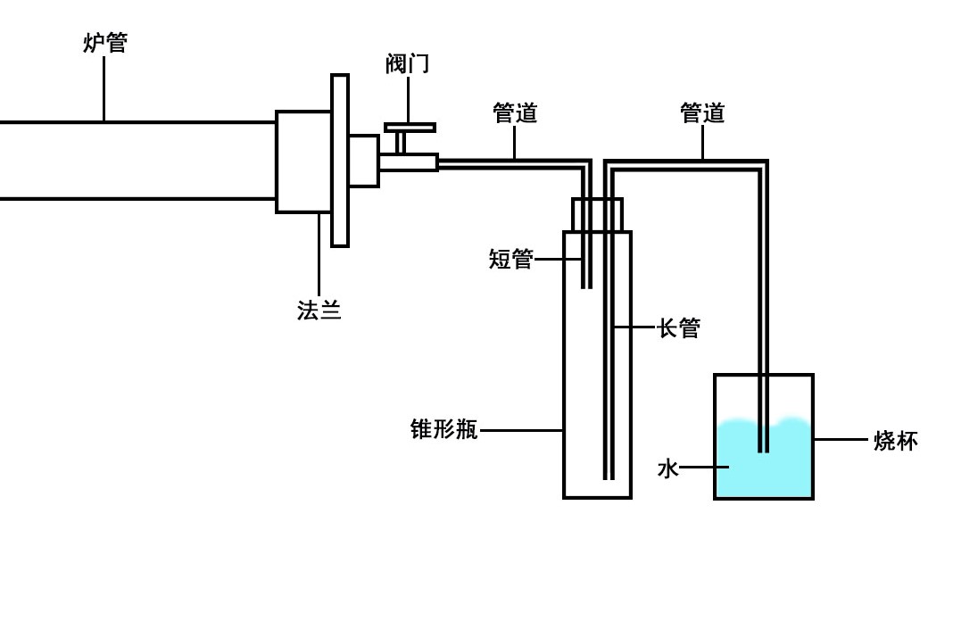 排水防倒吸法:把出气口的管道接到锥形瓶短管的进气管上,把锥形瓶长管的出气口接上管道、然后放入装满水的烧杯内,烧杯要放到户外(如果是有毒性或危险性气体),把出气阀门打到最大,通过进气阀门或流量计调节气体流量,因为烧杯内的水有一定的深度,气体要想冒出来,气体在炉内必须有一定的微正压,水管的插入深度决定炉管内压力大小,由于出气口阀门调到最大了,所以炉体内压力不会过大(因为出气口阀门大于进气口阀门),超过水压就会冒出来,这种方式刚好达到自动调节炉管内压力平衡的效果,可以通过烧杯的冒泡观察气体是否流出和流出的速度,一定要保证出气口有气体流出,否则烧杯里水会倒吸入锥形瓶内,这个锥形瓶就是起到一个防倒吸的作用,防止水直接进入石英管。